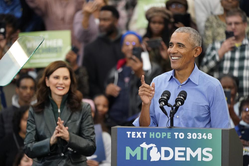 Former President Obama campaigns for Michigan Governor Whitmer during a rally on Saturday, Oct. 29, in Detroit. Photo: Carlos Osorio/AP