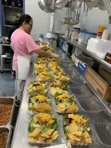 A food service worker builds taco salads. DPS has recently secured federal funding to make school lunches completely free.