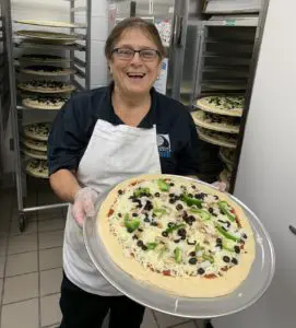 DPS food specialist Nina Rizzo holds a vegetarian pizza destined for the oven