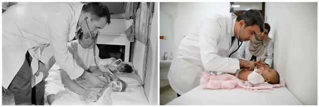 A combination picture shows a doctor examining a child in Baqaa camp, near Amman, Jordan, in this handout picture believed to be taken in 1969. UNRWA/Handout via REUTERS (L) and a doctor examining a child at a health center at Baqaa Palestinian refugee camp, September 29.