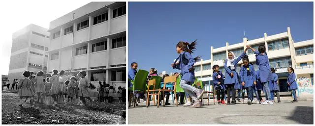 A combination picture shows Palestinian school girls waiting in line to collect UNRWA prepared food parcels during the first intifada in the Gaza Strip in this handout picture believed to be taken in 1988. UNRWA Handout via Reuters (L) and Palestinian school girls waiting in line to collect snacks in a UNRWA-run school in the Gaza Strip, September 2. – Reuters