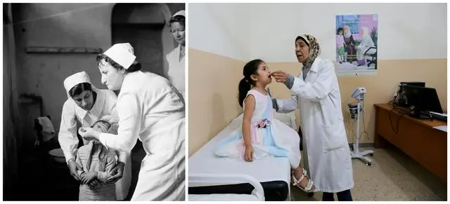 A combination picture shows nurses treating a child at an UNRWA health center for Palestinian refugees in Beirut, Lebanon in this handout picture believed to be taken in 1952. UNRWA handout via Reuters (L) and a Palestinian refugee girl receives a vaccination at an UNRWA clinic at Burj al-Barajneh refugee camp in Beirut, Lebanon, June 23. – Reuters