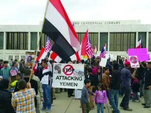 Local Yemeni Americans demonstrate against the Saudi-led strikes against their homeland in front of the Ford Centennial Library in Dearborn.