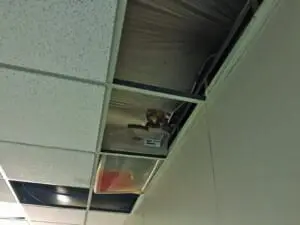 The leaky roof at Zaman International that is getting replaced because of support from crowdfunding through LaunchGood.